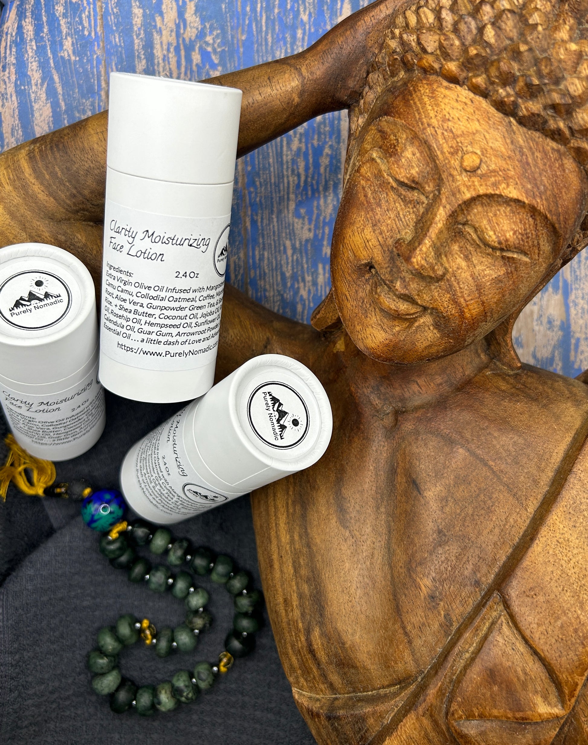 Clarity Face Lotion starts with a huge list of botanical ingredients that are mixed into pure extra virgin olive oil and infused for a minimum of 3 months. This oil is then strained to remove the solid herbs, leaving the botanical properties within the oil. This mix of Mangosteen Fruit, Camu Camu, Colloidal Oatmeal, Coffee, Marshmallow Root, Aloe Vera, Gunpowder Green Tea, & Basmati Rice is packed full of anti-inflammatory, anti-aging properties to aid the body's ability to retain moisture, fight the signs of aging, and calm your sensitive skin. As usual, this lotion is crafted by hand and contains no added fillers. The pure oils in this product were formulated to ensure maximum hydration while allowing the lotion to feel light and safe for facial application.